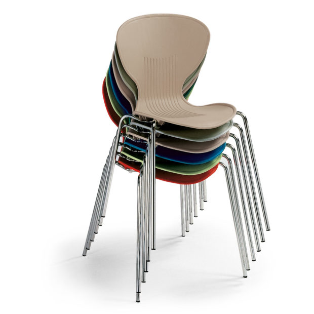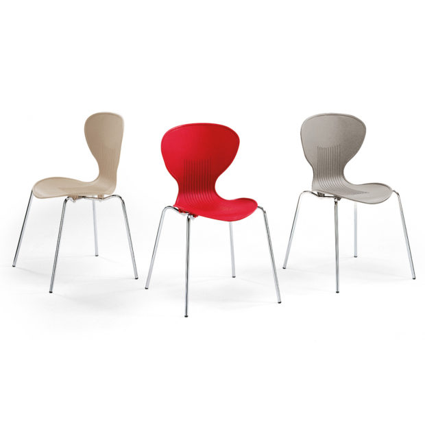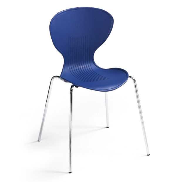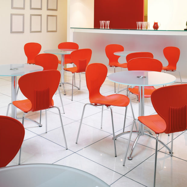 A modern bistro chairs manufactured with a bright chrome frame finish and durable polypropylene shell. Flash 4-leg is ideal in breakout areas, providing excellent comfort and stacking up to 6 chairs high. The extensive range is available 4-leg, skid-base, stool and beam configurations.